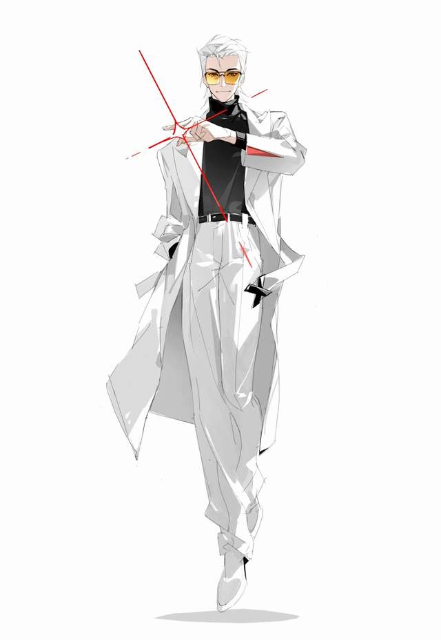 - Tóc trắng vuốt ngược ra sau, đeo kính gọng vuông tròng màu cam.