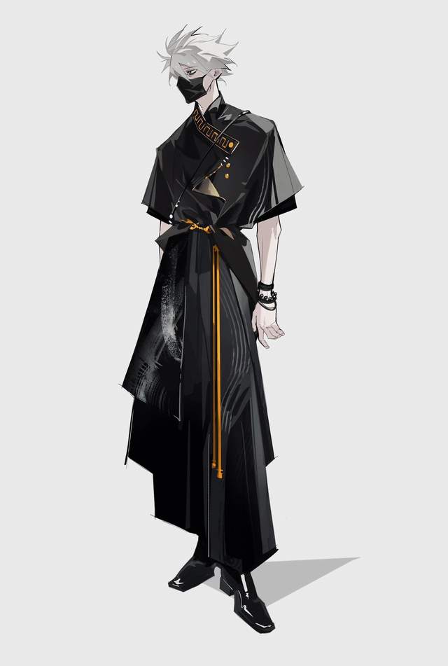 Anh khoác một chiếc áo choàng đen dài viền vàng với gấu áo rách, bên trong là bộ đồ đen có các chi tiết màu vàng kim.