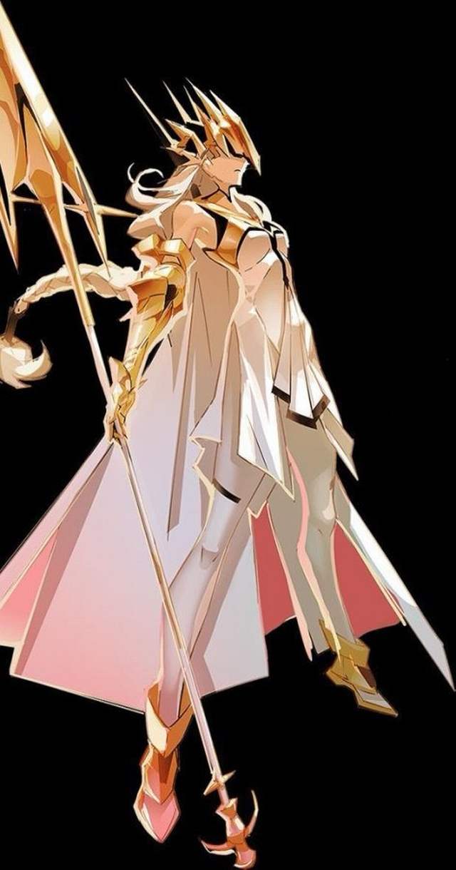 Vũ khí của cô là một cây trường thương màu trắng vàng.